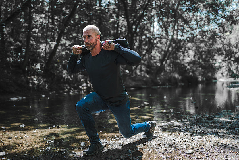 Man in weighted vest and Covert pants in the forest